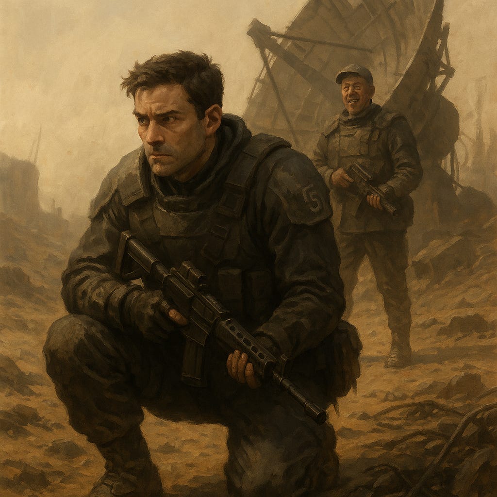 We were five klicks deep into the Red Zone trenchline, shadowing the outer rim of a collapsed solar array—the kind the Technocults used for planetary scans and soul-fracking. No birds, no hum. Just the hiss of old cables sighing in the dust. Our uplink was dead and my jaw clicked every time I chewed from the tension of holding back what needed to be said.