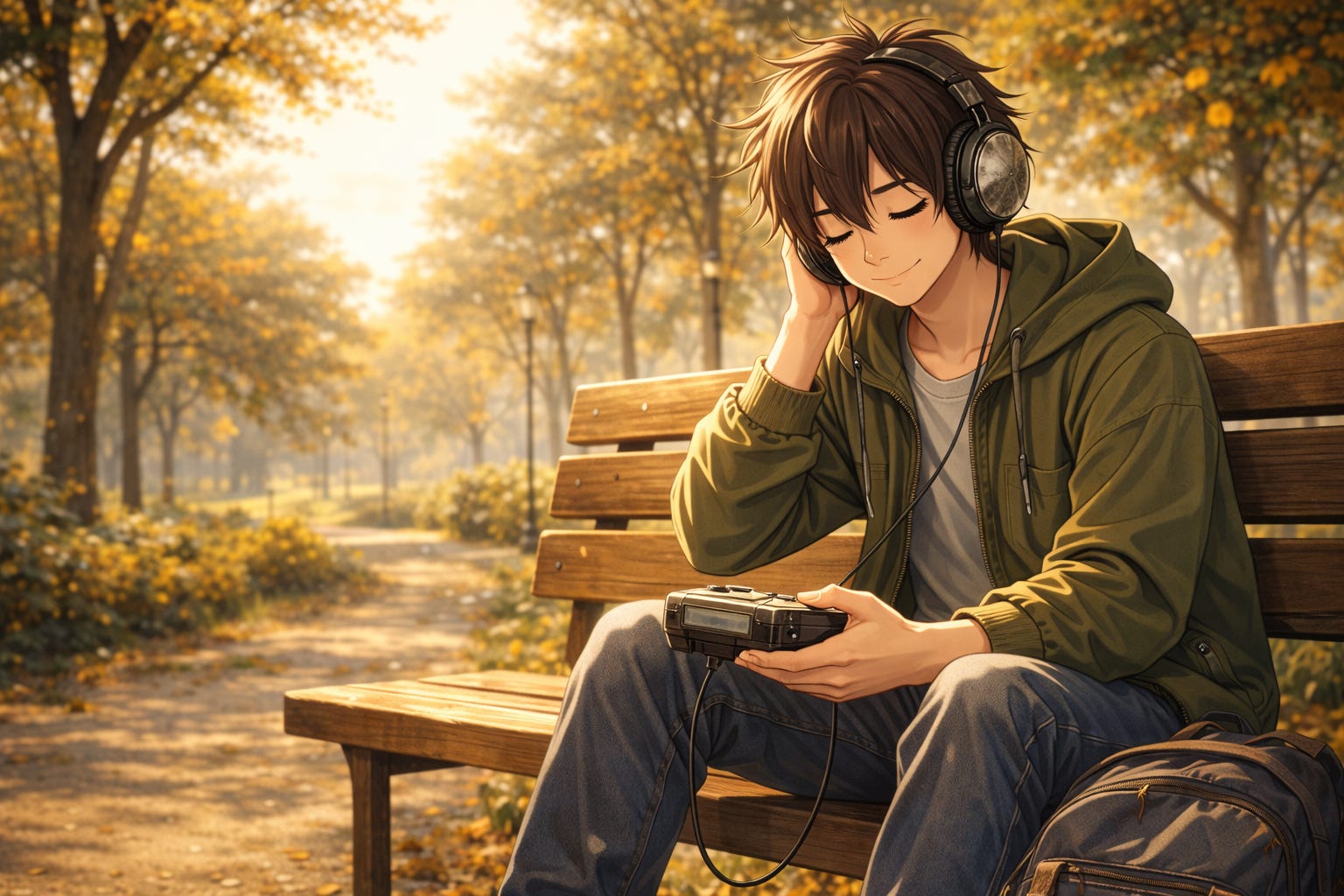At the park, a boy sat on a bench with a backpack at his feet, listening to something old. Battered headphones. Nodding along. Smiling like he knew a secret.