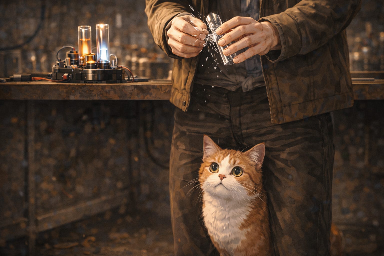 A soft sound. Almost polite. A spidering of cracks, then collapse. Shards spilled across the tile. He froze—not in panic. Assessment. Then he saw the cat step into the doorway, curious, nose down.