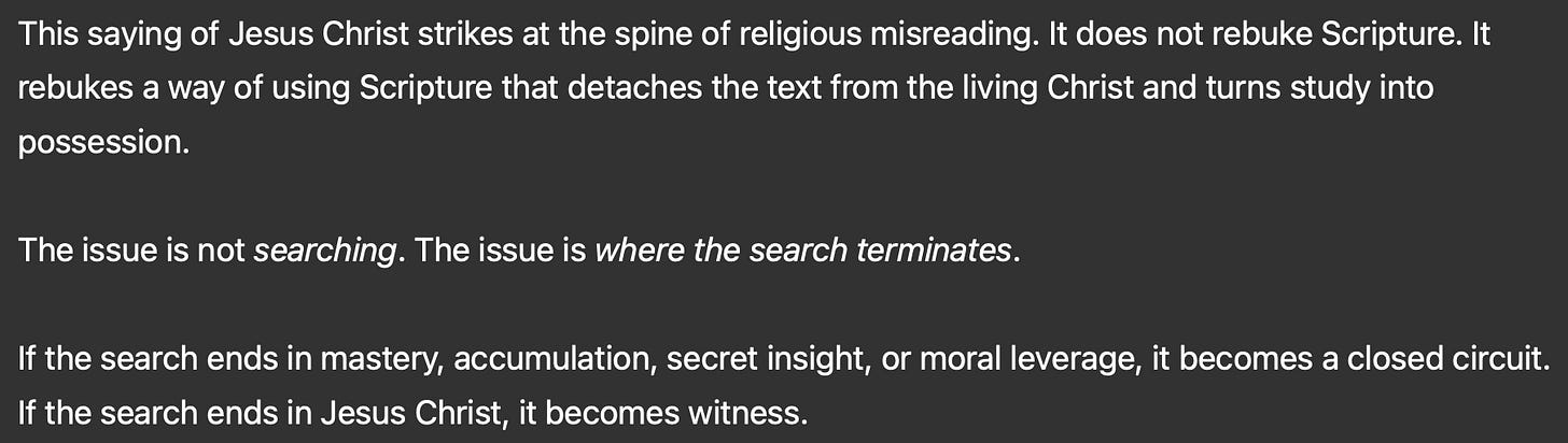 The Christian faith does not work this way. The Bible does not say, “If only you knew more, then you’d find peace.” It says, “You search the Scriptures, but it is they that testify to Me.” ⬅️ Click that Link for More of This ⬇️!
