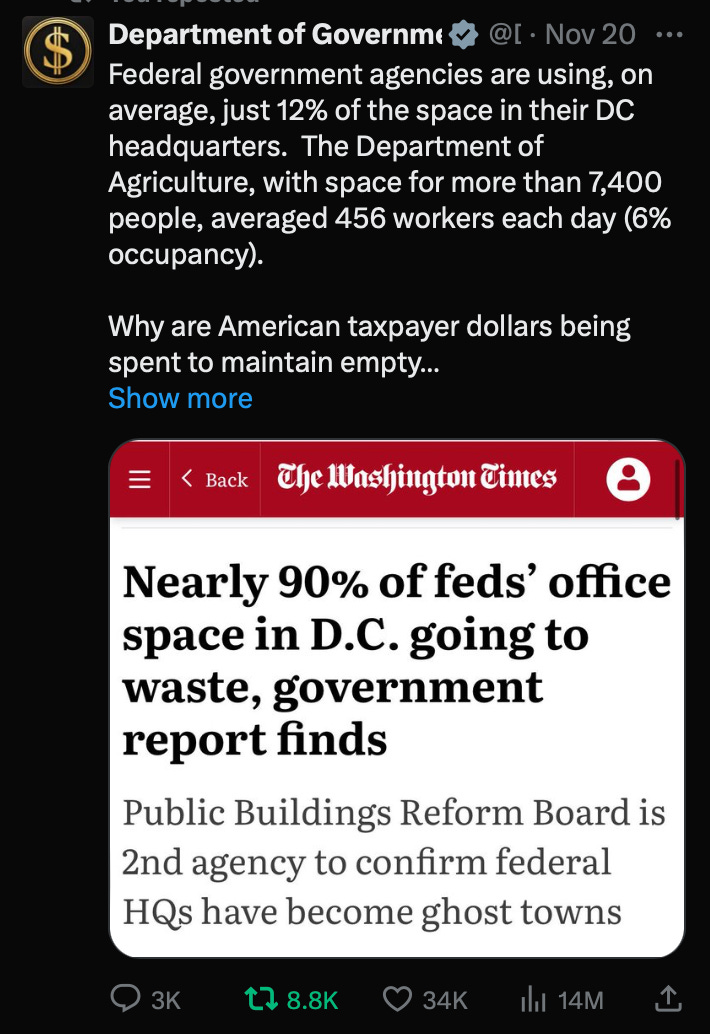 • Mandatory in-office work: Federal employees will return to their desks, making some “voluntary departures” a win-win for everyone (although this alone has led to many rumors about mass resignations if implemented. That this is a “self-own” that furthers the gameplay of the incumbents appears to be beyond them.)