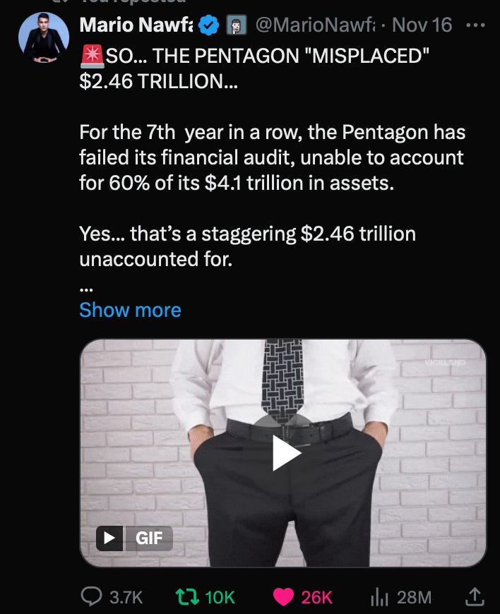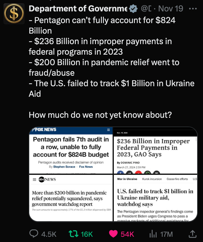 The Pentagon, a federal money pit managing an $800 billion budget but failing every audit it’s ever taken. Musk and Ramaswamy’s plan includes audits across all federal agencies, starting with defense.