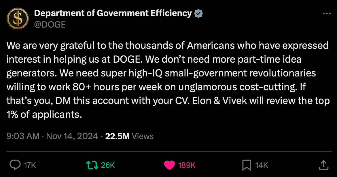 Musk and Ramaswamy might be fools. But they are evidently men driven be conviction. They believe you fix bloated bureaucracy but shrinking it. Trim the fat—with insight and intent.