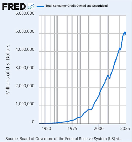 Consumers finished the sentence with credit cards. Plastic is not a discretionary tool; it is structural liquidity. That is, Americans are borrowing from tomorrow to survive yesterday, AND the system now depends on this borrowing to keep the denominator (the fiat currency) breathing.