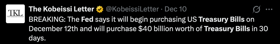The Federal Reserve printing $40 billion in the next 30 days is not CPR. It’s a Weekend at Bernie’s. Because private demand is no longer deep enough to absorb issuance at current rates, the government is issuing bills faster than the market wants them. This is a full conversion of the Federal Reserve from a backstop into a rollover-dependent debt structure. This is the nationalization of the bond market, not “quantitative easing” as social drinking but as permanent addiction.