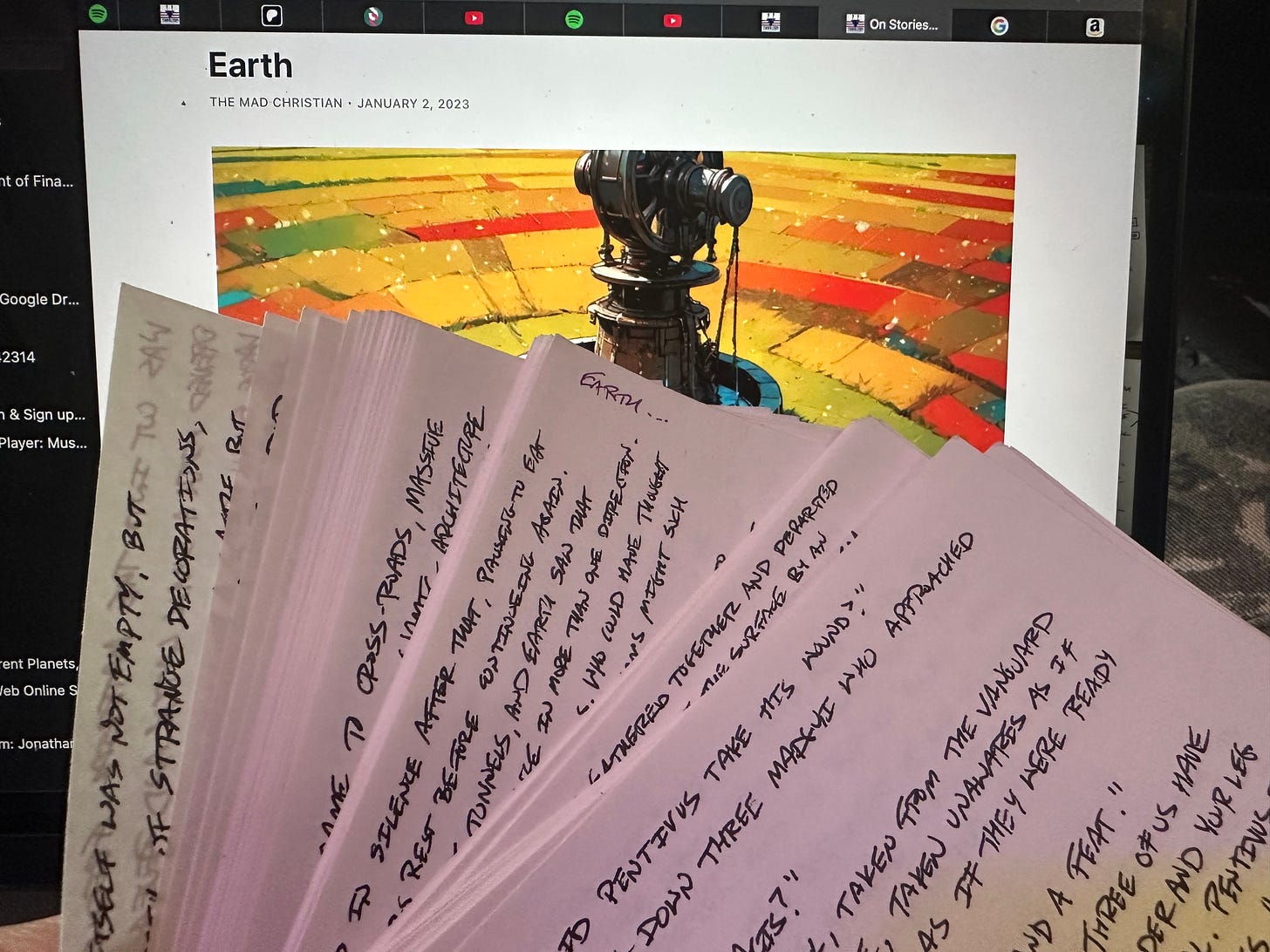 With a new lightness of heart, I return to these projects in earnest now. Earth is being re-released in serial as behind-the-scenes my compatriot Frisby the Hand sets to the task of type editing for Amazon release. Combing through multiple digital manuscripts is no small task, so this week’s Chapter 6 re-release is on pause while Christmas season heats up the demands on time. But make no mistake in your prayers: along with Teaching the Bible because it is true, I was born for this. Any future that sees my heart set free to chase the rainbow and not look back includes these stories meeting their termination in paperback somewhere on your shelf.