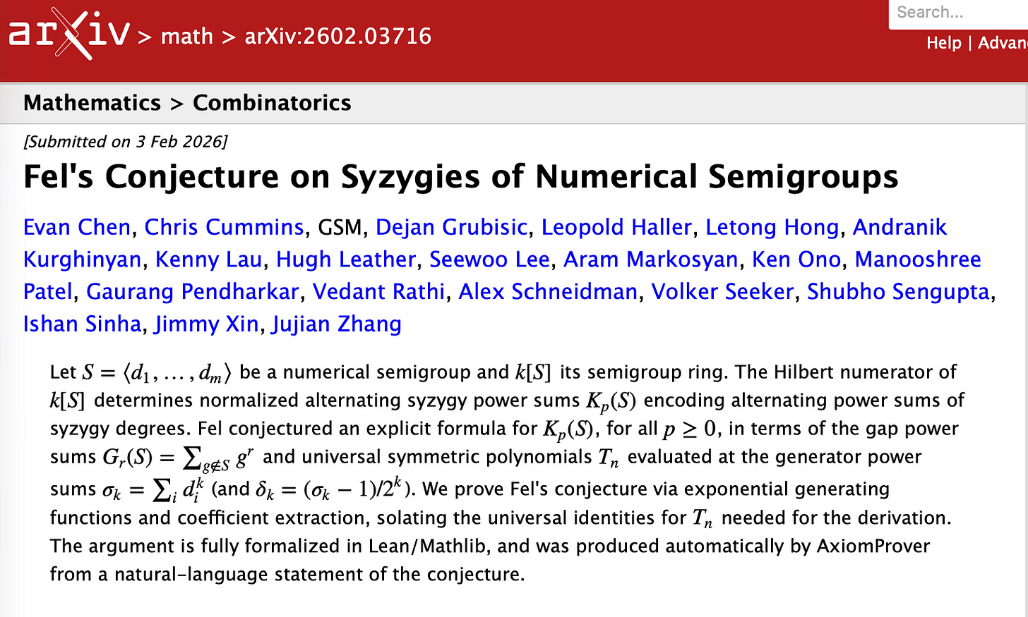 Fel’s conjecture on syzygies of numerical semigroups—an open problem in abstract algebra—was resolved by a language model producing a complete, formally verified proof in Lean. Intermediate lemmas. Auxiliary identities. Final argument. Every step mechanically checked. No intuition gaps. No narrative shortcuts.